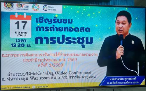 ตามที่ กรมการพัฒนาชุมชน ได้แต่งตั้งคณะกรรมการติดตามเร่งรัดการใช้จ่ายงบประมาณ รายจ่ายประจำปี พ.ศ.2569 ของกรมการพัฒนาชุมชน เพื่อเร่งรัดการใช้จ่ายงบประมาณให้เป็นไปตามเป้าหมายการใช้จ่ายงบประมาณ จึงดำเนินการประชุมคณะกรรมการติดตามเร่งรัดการใช้จ่ายงบประมาณรายจ่ายประจำปี งบประมาณ พ.ศ.2569 ของกรมพัฒนาชุมชน ครั้งที่ 3/2569 ผ่านระบบ (Video Conference) เเละผ่านทีวี พช. ณ ห้องประชุมราชพฤกษ์ ศูนย์ศึกษาและพัฒนาชุมชนนครศรีธรรมราช