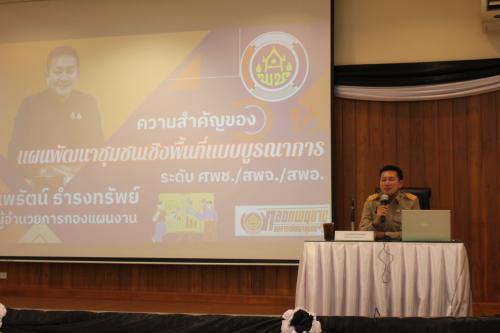 3) บรรยายหัวข้อ “ความสำคัญของแผนพัฒนาชุมชนเชิงพื้นที่แบบบูรณาการ ระดับ ศพช./สพจ./สพอ.” โดย นายนพรัตน์ ธำรงทรัพย์ ผู้อำนวยการกองแผนงาน